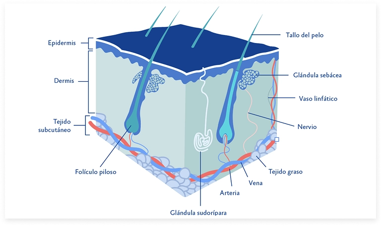 El folículo piloso es una pequeña estructura ubicada bajo la piel donde nace y se desarrolla cada cabello. Está presente en casi toda nuestra piel, menos en zonas como las palmas, las plantas de los pies y los labios. Se extiende desde la capa externa (epidermis) hasta la capa más profunda (dermis), y es clave para la salud capilar.